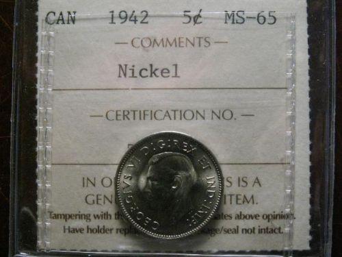 1942 5 Cents Nickel ICCS MS65. Fully struck with strong lustre. Lovely surfaces. Rare and very popular in the condition.