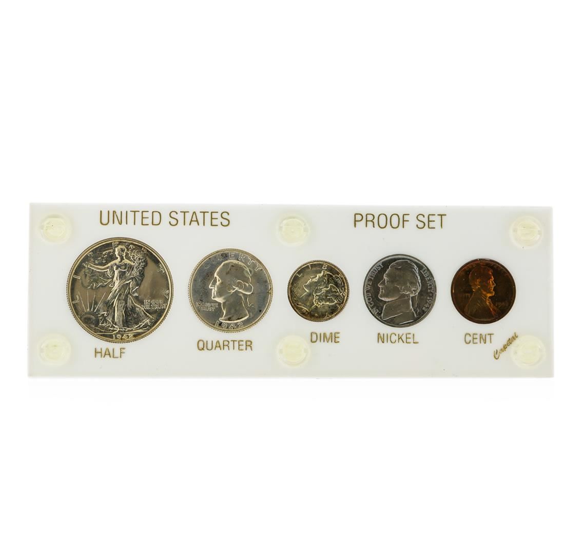 This 1942 (5) Coin Proof Set includes the following coins: 1942 Walking Liberty Half Dollar, 1942 Washington Quarter, 1942 Mercury Dime, 1942 Jefferson Nickel, and a 1942 Lincoln Wheat Cent.