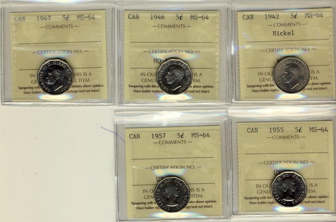 1942 5¢ Nickel, 1946, 1947, 1955 & 1957 ICCS MS64. Lot of 5 coins.