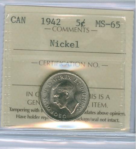 1942 5¢ Nickel ICCS MS65 Nickel. A gem example, extremely difficult to find in this grade.