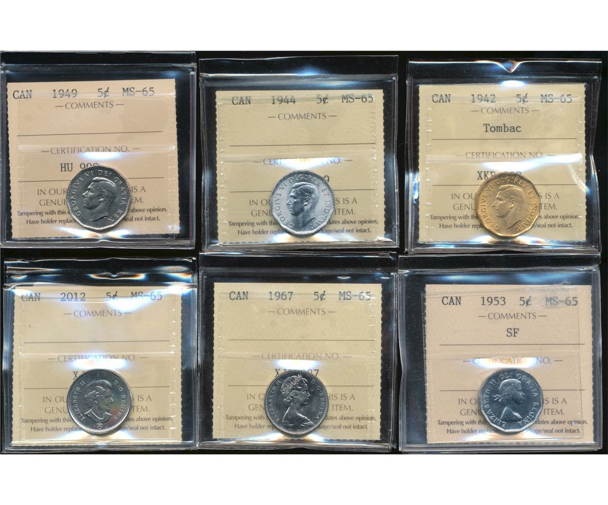 1942 5¢ Tom, 1944, 1949, 1953 SF, 1967 & 2012 ICCS MS65. Lot of 6 coins.