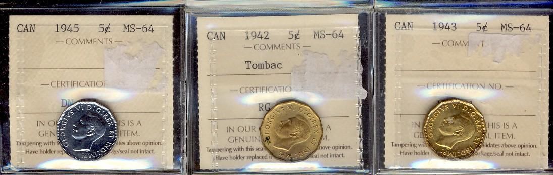 1942 5¢ Tombac, 1943 & 1945 5¢ ICCS MS64. Lot of 3 coins.