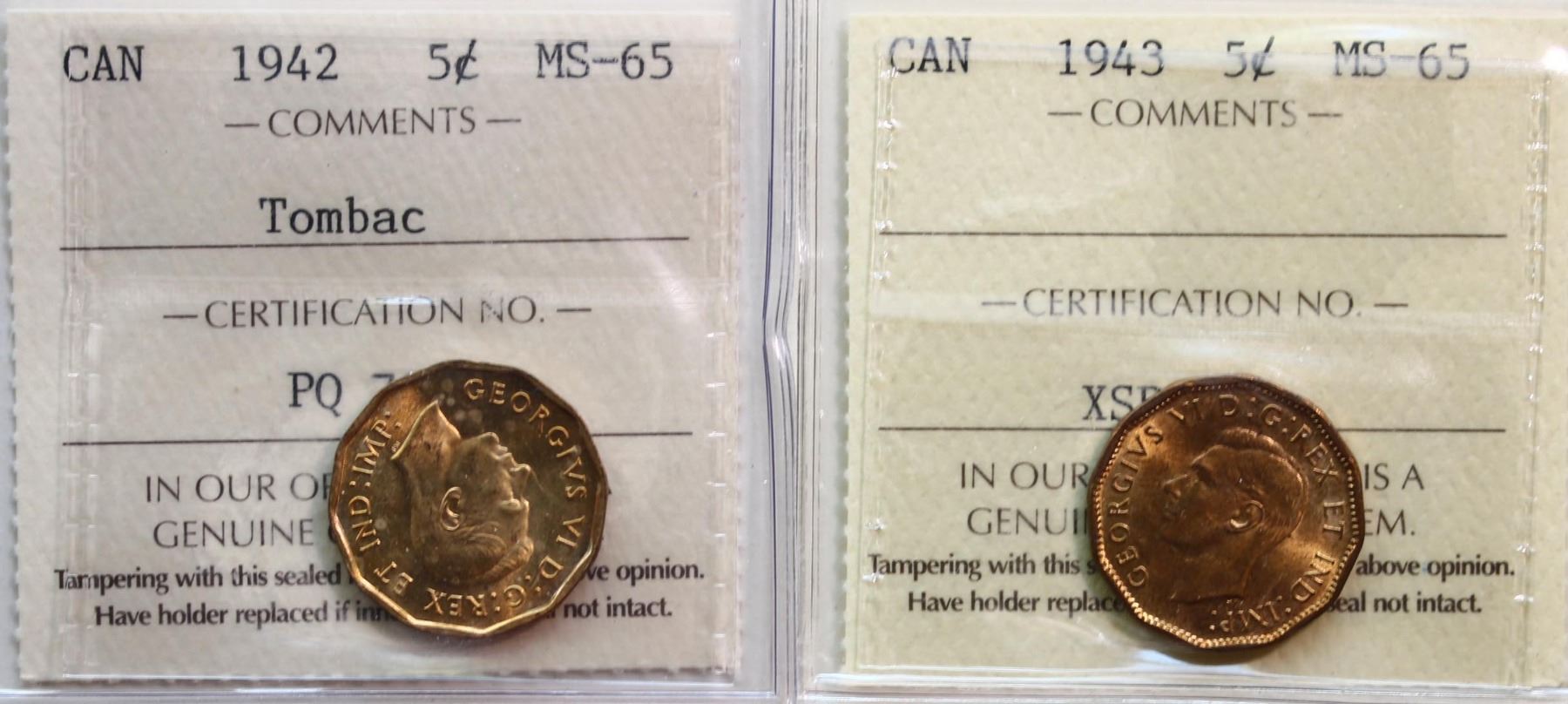 1942 5¢ "Tombac" & 1943 "Tombac" Both coins ICCS Gem Mint State-65.