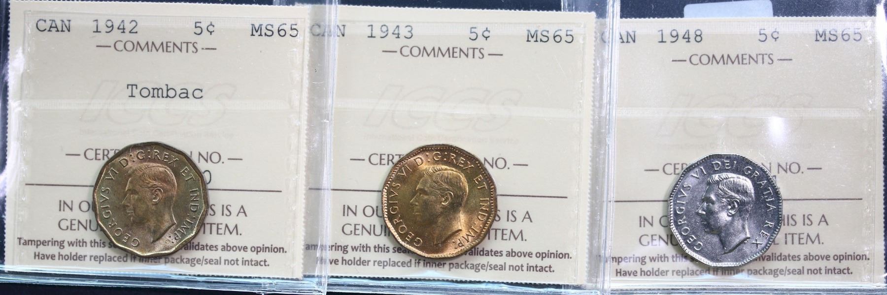 1942 5¢ Tombac, 1943, and 1948 ICCS Gem Mint State-65, lot of 3 coins.