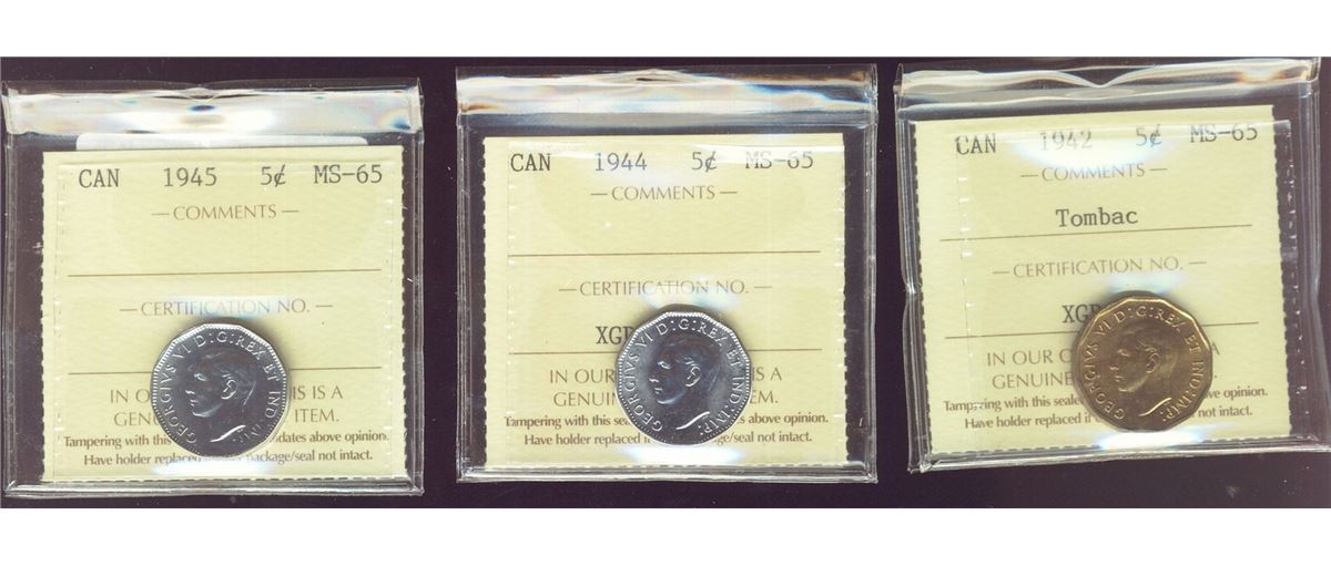 1942 5¢ Tombac, 1944 & 1945 ICCS MS65 Lot of 3 coins.