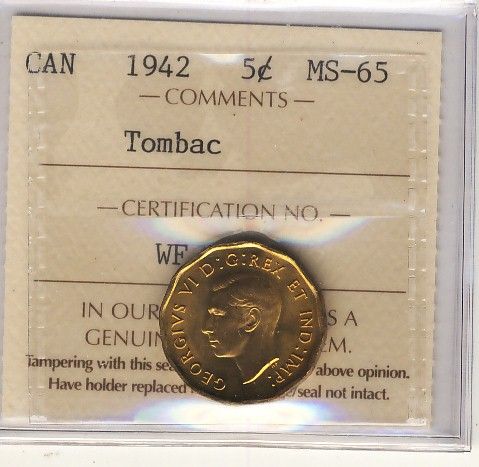 1942 5¢ Tombac ICCS MS65. Flashy example.