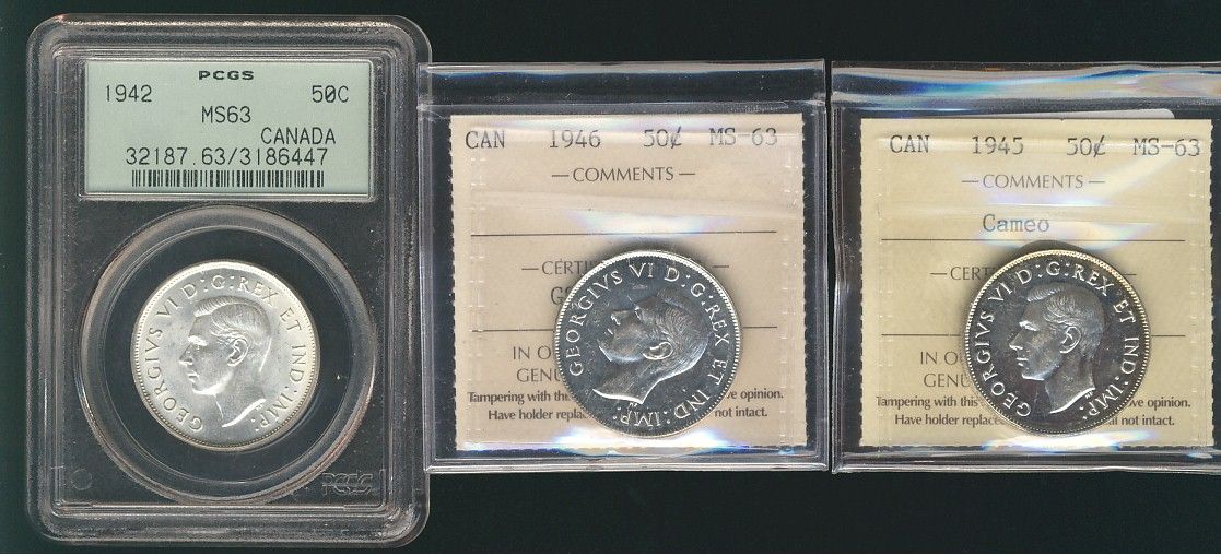 1942 50¢, 1946 & 1945 all certified MS63 examples with 1945 designated Cameo.