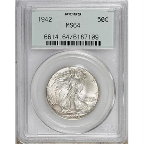 <B>1942 50C MS64 PCGS.</B></I> PCGS Population (4625/7685). NGC Census: (2985/6203). Mintage: 47,839,120. Numismedia Wsl. Price for NGC/PCGS coin in MS64: $48. (#6614)<BR><BR><B>Coin Engraver:</B> Adolph A. Weinman<BR><BR><b>Shipping:</b> Coins & Currency (<a target="_blank" href="http://www.heritageauctions.com/common/shipping.php">view shipping information</a>)