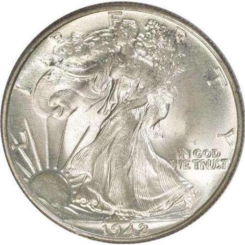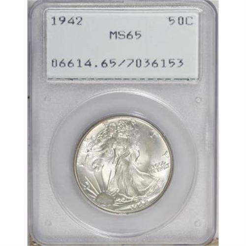 <B>1942 50C MS65 PCGS.</B></I> PCGS Population (5379/2306). NGC Census: (3949/2254). Mintage: 47,839,120. Numismedia Wsl. Price for NGC/PCGS coin in MS65: $124. (#6614)<BR><BR><B>Coin Engraver:</B> Adolph A. Weinman<BR><BR><b>Shipping:</b> Coins & Currency (<a target="_blank" href="http://www.heritageauctions.com/common/shipping.php">view shipping information</a>)