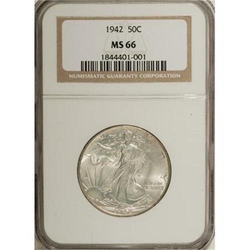 <B>1942 50C MS66 NGC.</B></I> NGC Census: (1959/260). PCGS Population (2069/163). Mintage: 47,839,120. Numismedia Wsl. Price for NGC/PCGS coin in MS66: $180. (#6614)<BR><BR><b>Shipping:</b> Coins & Currency (<a target="_blank" href="http://www.heritageauctions.com/common/shipping.php">view shipping information</a>)
