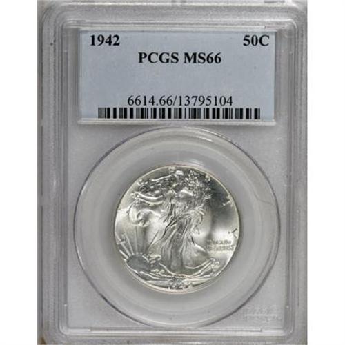<B>1942 50C MS66 PCGS.</B></I> PCGS Population (2097/172). NGC Census: (1971/263). Mintage: 47,839,120. Numismedia Wsl. Price for NGC/PCGS coin in MS66: $200. (#6614)<BR><BR><B>Coin Engraver:</B> Adolph A. Weinman<BR><BR><b>Shipping:</b> Coins & Currency (<a target="_blank" href="http://www.heritageauctions.com/common/shipping.php">view shipping information</a>)