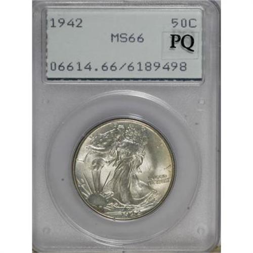 <B>1942 50C MS66 PCGS.</B></I> PCGS Population (2141/178). NGC Census: (2000/266). Mintage: 47,839,120. Numismedia Wsl. Price for NGC/PCGS coin in MS66: $200. (#6614)<BR><BR><B>Coin Engraver:</B> Adolph A. Weinman<BR><BR><b>Shipping:</b> Coins & Currency (<a target="_blank" href="http://www.heritageauctions.com/common/shipping.php">view shipping information</a>)