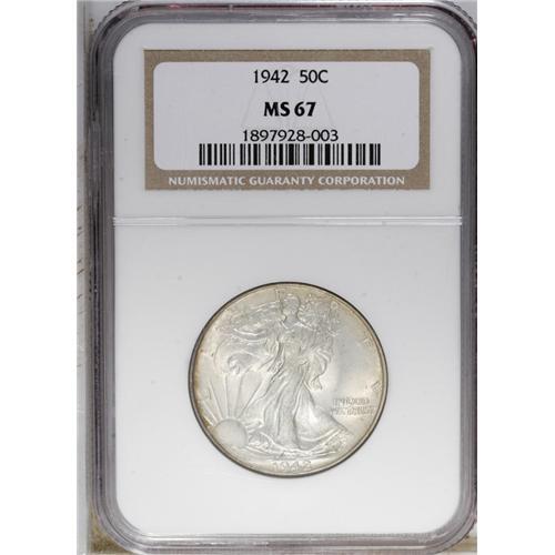 <B>1942 50C MS67 NGC.</B></I> A crisply struck piece, highly lustrous beneath hazy gold-gray patina that turns to golden-brown at the periphery. NGC has certified just one finer example (9/06).<BR><BR><b>Shipping:</b> Coin/Currency (<a target="_blank" href="http://www.heritageauctions.com/common/shipping.php">view shipping information</a>)