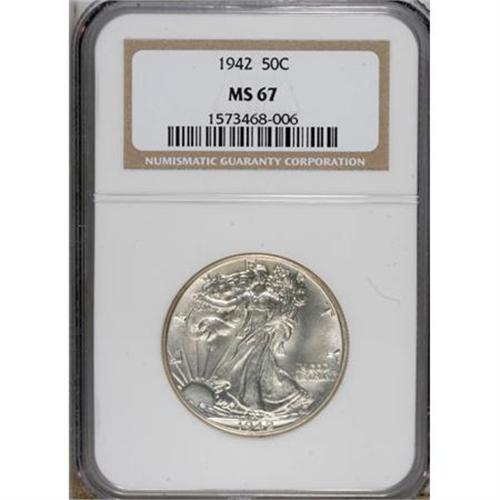 <B>1942 50C MS67 NGC.</B></I> Surprisingly crisp detail characterizes this shining short-set Superb Gem. Powerful luster and faint wisps of champagne color only enhance the overall visual appeal.<BR><BR><b>Shipping:</b> Coins & Currency (<a target="_blank" href="http://www.heritageauctions.com/common/shipping.php">view shipping information</a>)