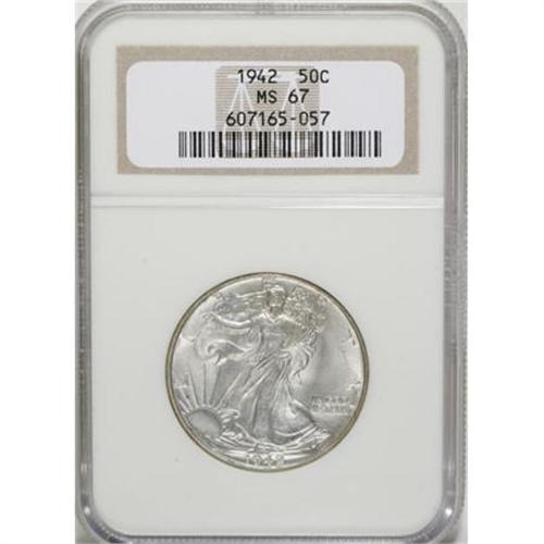 <B>1942 50C MS67 NGC.</B></I> NGC Census: (262/1). PCGS Population (168/4). Mintage: 47,839,120. Numismedia Wsl. Price for NGC/PCGS coin in MS67: $750. (#6614)<BR><BR><B>Coin Engraver:</B> Adolph A. Weinman<BR><BR><b>Shipping:</b> Coins & Currency (<a target="_blank" href="http://www.heritageauctions.com/common/shipping.php">view shipping information</a>)