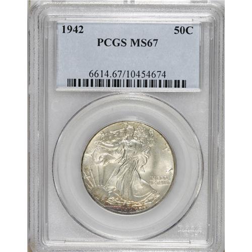 <B>1942 50C MS67 PCGS.</B></I> Fully struck with bright satiny luster and nearly pristine surfaces. A swath of red-brown toning across the lower edge of the obverse is the only significant departure from a generally untoned appearance.<BR><BR><b>Shipping:</b> Coins & Currency (<a target="_blank" href="http://www.heritageauctions.com/common/shipping.php">view shipping information</a>)