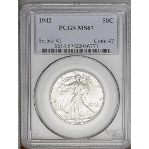 <B>1942<50C> MS67 PCGS.</B></I> Lemon color endows this powerfully struck and highly lustrous Superb Gem. Extensive examination is required to locate even the most trivial contact, and the collector who desires the finest affordable quality need look no further than the present outstanding example.