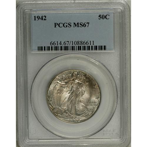 <B>1942 50C MS67 PCGS.</B></I> Well struck and lustrous, with an attractive coating of speckled, variegated patina on both sides. The blemish-free surfaces reveal rose, sea-green and gold-orange coloration. A beautiful Superb Gem Walker.<BR><BR><b>Shipping:</b> Coin/Currency (<a target="_blank" href="http://www.heritageauctions.com/common/shipping.php">view shipping information</a>)