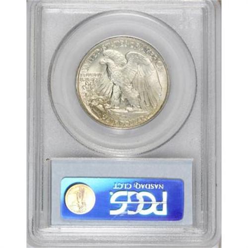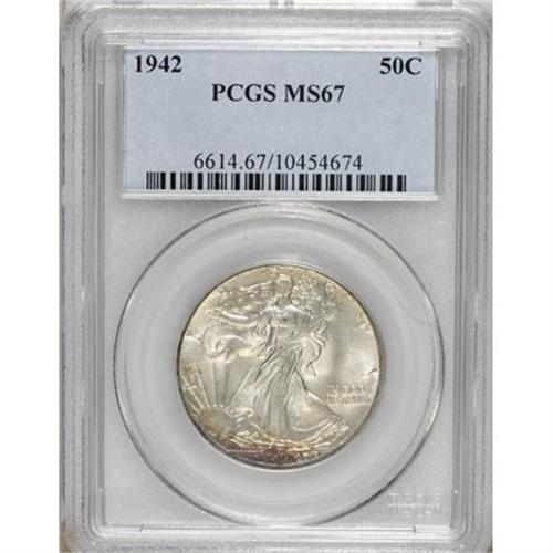 <B>1942 50C MS67 PCGS.</B></I> Fully struck with bright satiny luster and nearly pristine surfaces. A swath of red-brown toning across the lower edge of the obverse is the only significant departure from a generally untoned appearance. <BR><BR><B>Coin Engraver:</B> Adolph A. Weinman<BR><BR><b>Shipping:</b> Coins & Currency (<a target="_blank" href="http://www.heritageauctions.com/common/shipping.php">view shipping information</a>)