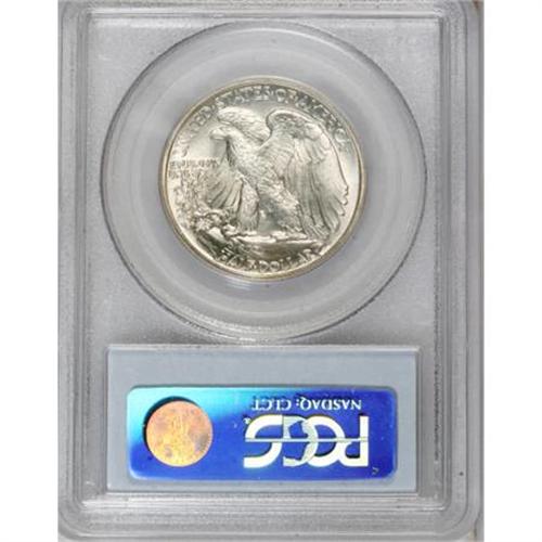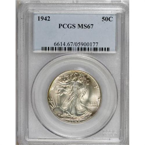<B>1942 50C MS67 PCGS.</B></I> Solidly struck with strong luster and faint hints of golden toning in the carefully preserved fields. This short-set Philadelphia issue is exceedingly elusive any better; PCGS has certified a mere four finer examples (10/07).<BR><BR><B>Coin Engraver:</B> Adolph A. Weinman<BR><BR><b>Shipping:</b> Coins & Currency (<a target="_blank" href="http://www.heritageauctions.com/common/shipping.php">view shipping information</a>)