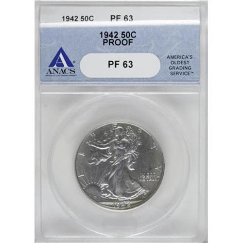 <B>1942 50C PR63 ANACS.</B></I> . NGC Census: (97/3579). PCGS Population (322/4980). Mintage: 21,120. Numismedia Wsl. Price for NGC/PCGS coin in PR63: $340. (#6642)<BR><BR><B>Coin Engraver:</B> Adolph A. Weinman<BR><BR><b>Shipping:</b> Coins & Currency (<a target="_blank" href="http://www.heritageauctions.com/common/shipping.php">view shipping information</a>)