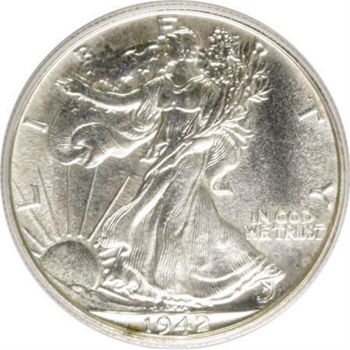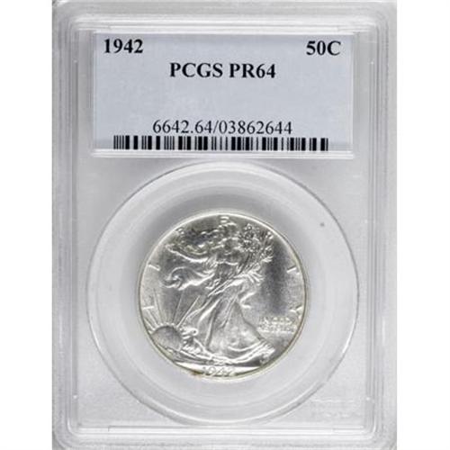 <B>1942 50C PR64 PCGS.</B></I> PCGS Population (1187/3725). NGC Census: (562/2897). Mintage: 21,120. Numismedia Wsl. Price for NGC/PCGS coin in PR64: $464. (#6642)<BR><BR><B>Coin Engraver:</B> Adolph A. Weinman<BR><BR><b>Shipping:</b> Coins & Currency (<a target="_blank" href="http://www.heritageauctions.com/common/shipping.php">view shipping information</a>\)