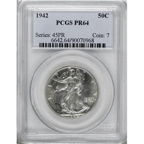 <B>1942 50C PR64 PCGS.</B></I> PCGS Population (1194/3817). NGC Census: (579/3007). Mintage: 21,120. Numismedia Wsl. Price for NGC/PCGS coin in PR64: $460. (#6642)<BR><BR><B>Coin Engraver:</B> Adolph A. Weinman<BR><BR><b>Shipping:</b> Coins & Currency (<a target="_blank" href="http://www.heritageauctions.com/common/shipping.php">view shipping information</a>)