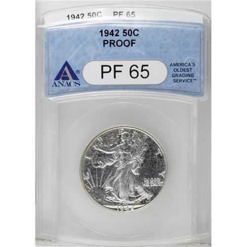 <B>1942 50C PR65 ANACS.</B></I> Light haze scarcely dims the mirrors of this bright Gem. The devices are generally untoned, though light green patina is noted on the eagle's leg.<BR><BR><b>Shipping:</b> Coin/Currency (<a target="_blank" href="http://www.heritageauctions.com/common/shipping.php">view shipping information</a>)