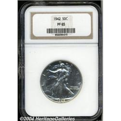 <B>1942<50C> PR65 NGC.</B></I> A brilliant and flashy Gem with a needle-sharp strike and virtually undisturbed surfaces. World War II put an end to the production of proofs. The mints were also busy with increased demand for coins in circulation, and numerous foreign issues further strained capacity. <BR><BR><B>Important notice:</B> Heritage usually auctions material at the rate of 200-250 lots per hour. On some occasions eBay Live bid software or the Internet may not be able to keep up with the pace of the auction. We recommend placing a realistic absentee bid now as insurance to avoid disappointment. Occasionally the auctioneer may eliminate or reject an eBay Live bid, and the auctioneer may also reopen a lot after the close of the eBay live bidding (usually because we missed an audience bid), and may reject your bid even if it shows you as the winning bidder. By bidding via eBay Live, you agree that Heritage may award the lot to another bidder at its sole discretion under the circumstances described above or any other reasonable circumstances. Since eBay bids are not shown to us until we open the lot on the floor, we treat those bids just like floor bids. In most cases the floor responds before the eBay bid is presented to us, due to Internet lag time, so for consistency we have made it a policy that floor bids are always considered first over tie eBay live bids. Also please note that all Heritage lots purchased through eBay Live carry a 20% Buyer's Premium. Please make sure you read the Terms and Conditions before you bid. </span></font></tr></table></td></tr></table>