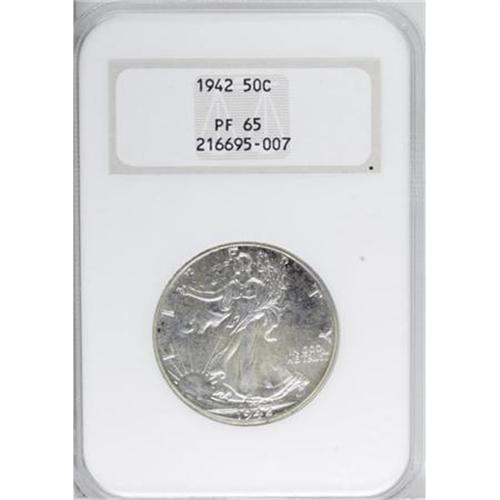 <B>1942 50C PR65 NGC.</B></I> NGC Census: (838/2059). PCGS Population (1558/2167). Mintage: 21,120. Numismedia Wsl. Price for NGC/PCGS coin in PR65: $590. (#6642)<BR><BR><B>Coin Engraver:</B> Adolph A. Weinman<BR><BR><b>Shipping:</b> Coins & Currency (<a target="_blank" href="http://www.heritageauctions.com/common/shipping.php">view shipping information</a>\)