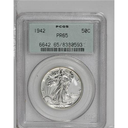 <B>1942<50C> PR65 PCGS.</B></I> A brilliant specimen with only the barest hint of ice-blue patina on the reverse. This Gem has clean fields and offers an affordable example of a Walking Liberty proof.
