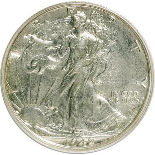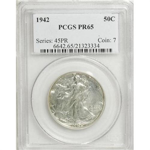 <B>1942 50C PR65 PCGS.</B></I> PCGS Population (1574/2208). NGC Census: (860/2137). Mintage: 21,120. Numismedia Wsl. Price for NGC/PCGS coin in PR65: $580. (#6642)<BR><BR><B>Coin Engraver:</B> Adolph A. Weinman<BR><BR><b>Shipping:</b> Coins & Currency (<a target="_blank" href="http://www.heritageauctions.com/common/shipping.php">view shipping information</a>)