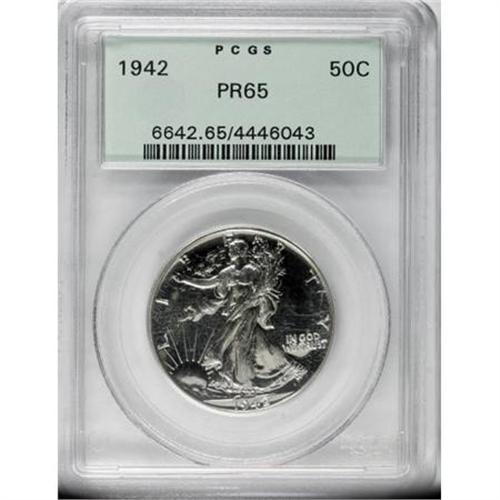 <B>1942 50C PR65 PCGS.</B></I> This needle-sharp Gem appears brilliant at first glance, although the eagle has a blush of faint gold toning. Flawless aside from a tiny spot above the O in GOD. Encapsulated in a green label holder.<BR><BR><B>Coin Engraver:</B> Adolph A. Weinman<BR><BR><b>Shipping:</b> Coins & Currency (<a target="_blank" href="http://www.heritageauctions.com/common/shipping.php">view shipping information</a>)