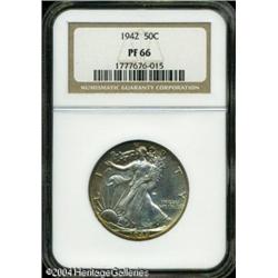 1942 50C PR66 NGC. A ring of reddish-gold toning a <B>1942 50C PR66 NGC.</B></I> A ring of reddish-gold toning adheres to the obverse border. Boldly struck, with no significant blemishes. <BR><BR><B>Important notice:</B> Heritage usually auctions material at the rate of 200-250 lots per hour. On some occasions eBay Live bid software or the Internet may not be able to keep up with the pace of the auction. We recommend placing a realistic absentee bid now as insurance to avoid disappointment. Occasionally the auctioneer may eliminate or reject an eBay Live bid, and the auctioneer may also reopen a lot after the close of the eBay live bidding (usually because we missed an audience bid), and may reject your bid even if it shows you as the winning bidder. By bidding via eBay Live, you agree that Heritage may award the lot to another bidder at its sole discretion under the circumstances described above or any other reasonable circumstances. Since eBay bids are not shown to us until we open the lot on the floor, we treat those bids just like floor bids. In most cases the floor responds before the eBay bid is presented to us, due to Internet lag time, so for consistency we have made it a policy that floor bids are always considered first over tie eBay live bids. Also please note that all Heritage lots purchased through eBay Live carry a 20% Buyer's Premium. Please make sure you read the Terms and Conditions before you bid. This lot is being auctioned in conjunction with a live floor auction by Heritage Galleries & Auctioneers. All final auction and invoice information will be supplied by Heritage Galleries & Auctioneers, and all other information should be considered preliminary. Lot:6306