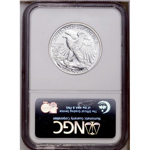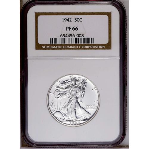 <B>1942<50C> PR66 NGC.</B></I> Glassy mirrors and brilliant surfaces account for the majority of the eye appeal on this popular proof Walker. Completely uniform in appearance, outside of a small brown spot near the eagle's right leg, and a contact mark on the left leg. <BR><BR><B>Important notice:</B> Heritage usually auctions material at the rate of 200-250 lots per hour. On some occasions eBay Live bid software or the Internet may not be able to keep up with the pace of the auction. We recommend placing a realistic absentee bid now as insurance to avoid disappointment. Occasionally the auctioneer may eliminate or reject an eBay Live bid, and the auctioneer may also reopen a lot after the close of the eBay live bidding (usually because we missed an audience bid), and may reject your bid even if it shows you as the winning bidder. By bidding via eBay Live, you agree that Heritage may award the lot to another bidder at its sole discretion under the circumstances described above or any other reasonable circumstances. Since eBay bids are not shown to us until we open the lot on the floor, we treat those bids just like floor bids. In most cases the floor responds before the eBay bid is presented to us, due to Internet lag time, so for consistency we have made it a policy that floor bids are always considered first over tie eBay live bids. Also please note that all Heritage lots purchased through eBay Live carry a 20% Buyer's Premium. Please make sure you read the Terms and Conditions before you bid. This lot is being auctioned in conjunction with a live floor auction by Heritage Galleries & Auctioneers. All final auction and invoice information will be supplied by Heritage Galleries & Auctioneers, and all other information should be considered preliminary. Lot:3061 <BR><BR><B>Winning Notification and Billing:</B> After the FINAL session in this auction is complete, Heritage will send e-mail and snail mail invoices. This process normally takes several days. All final auction and invoice information will be supplied by Heritage Galleries & Auctioneers, and all other information should be considered preliminary. <BR><BR>This auction will be conducted on a live auction floor and over the Internet through eBay Live. If you choose to place an absentee bid, please take a moment to <font color='#0000ff'><u><a href='http://pages.ebay.com/liveauctions/help/before/laabsentee.html'>learn how eBay Live absentee bidding works</a></u></font><font color='#000000'>