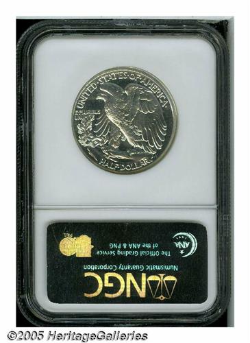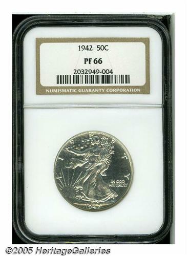 <B>1942<50C> PR66 NGC.</B></I> Near-blinding brilliance exudes from immaculately preserved surfaces which reveal some speckles of incipient milky color under magnification. Razor sharp definition characterizes all of the design elements, and the fields display wonderful mirrors.