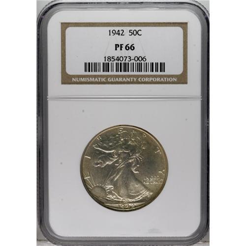 <B>1942 50C PR66 NGC.</B></I> Sharply struck with a light layer of milky patina on both sides. A lovely Premium Gem, devoid of contact marks or hairlines.<BR><BR><b>Shipping:</b> Coins & Currency (<a target="_blank" href="http://www.heritageauctions.com/common/shipping.php">view shipping information</a>)