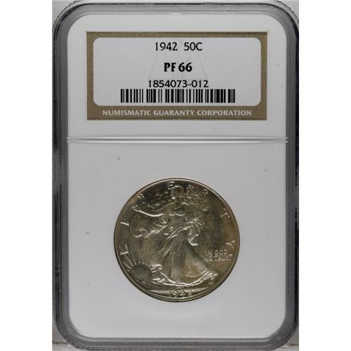 <B>1942 50C PR66 NGC.</B></I> The design elements are fully brought up, on both sides, and the surfaces are problem-free as expected. A slight degree of milky patina only slightly subdues the reflectivity in the fields of this lovely Premium Gem proof.<BR><BR><b>Shipping:</b> Coins & Currency (<a target="_blank" href="http://www.heritageauctions.com/common/shipping.php">view shipping information</a>)