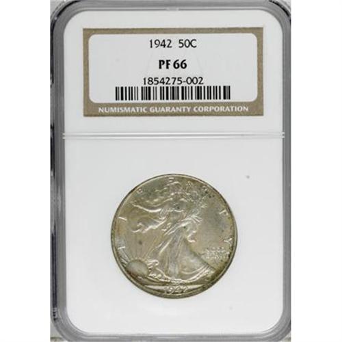 <B>1942 50C PR66 NGC.</B></I> Sharply struck and crisply detailed, as expected for a proof specimen. Both sides exhibit a thin layer of milky patina, which is not unattractive. An excellent Premium Gem example of the final proof issue in the Walking Liberty half dollar series. <BR><BR><b>Shipping:</b> Coins & Currency (<a target="_blank" href="http://www.heritageauctions.com/common/shipping.php">view shipping information</a>)