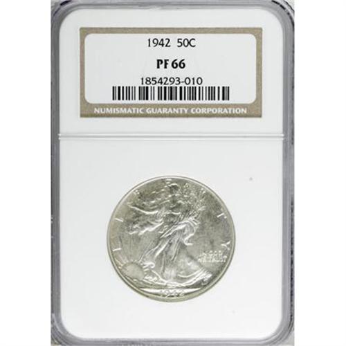 <B>1942 50C PR66 NGC.</B></I> Fully struck with deeply reflective fields that show a light layer of cloudy color on both sides. Immaculately preserved and seemingly pristine; a great Premium Gem proof. <BR><BR><B>Coin Engraver:</B> Adolph A. Weinman<BR><BR><b>Shipping:</b> Coins & Currency (<a target="_blank" href="http://www.heritageauctions.com/common/shipping.php">view shipping information</a>)