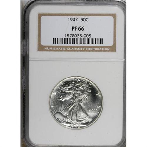 <B>1942 50C PR66 NGC.</B></I> NGC Census: (1222/851). PCGS Population (1462/724). Mintage: 21,120. Numismedia Wsl. Price for NGC/PCGS coin in PR66: $635. (#6642)<BR><BR><B>Coin Engraver:</B> Adolph A. Weinman<BR><BR><b>Shipping:</b> Coins & Currency (<a target="_blank" href="http://www.heritageauctions.com/common/shipping.php">view shipping information</a>)
