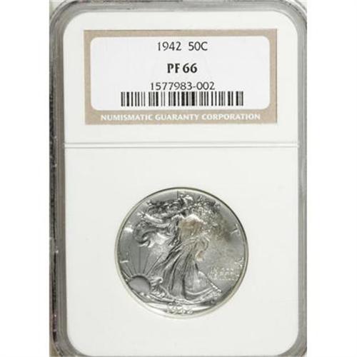 <B>1942 50C PR66 NGC.</B></I> NGC Census: (1252/885). PCGS Population (1473/735). Mintage: 21,120. Numismedia Wsl. Price for NGC/PCGS coin in PR66: $665. (#6642)<BR><BR><B>Coin Engraver:</B> Adolph A. Weinman<BR><BR><b>Shipping:</b> Coins & Currency (<a target="_blank" href="http://www.heritageauctions.com/common/shipping.php">view shipping information</a>)