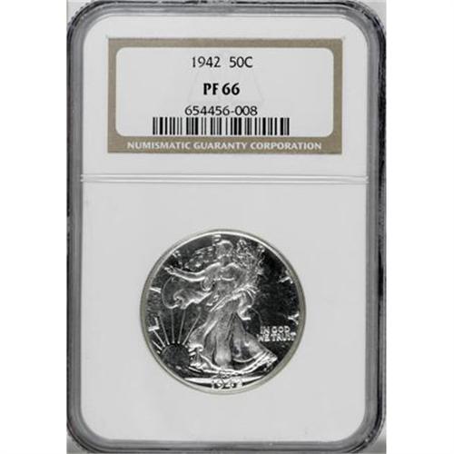<B>1942 50C PR66 NGC.</B></I> Glassy mirrors and brilliant surfaces enhance the eye appeal on this popular proof Walker. Completely uniform in appearance outside of a small brown spot near the eagle's right leg.<BR><BR><B>Coin Engraver:</B> Adolph A. Weinman<BR><BR><b>Shipping:</b> Coins & Currency (<a target="_blank" href="http://www.heritageauctions.com/common/shipping.php">view shipping information</a>)