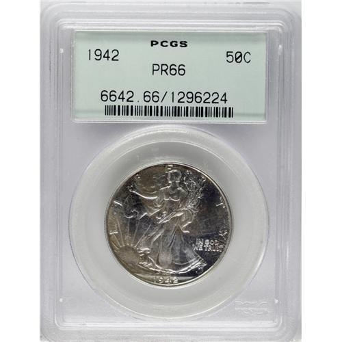 <B>1942 50C PR66 PCGS.</B></I> Light dashes of golden-brown, aqua, and magenta toning visit this prominently mirrored and meticulously struck Premium Gem. Housed in an old green label holder.<BR><BR><b>Shipping:</b> Coins & Currency (<a target="_blank" href="http://www.heritageauctions.com/common/shipping.php">view shipping information</a>)