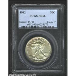 1942 50C PR66 PCGS. Warm tan-gray patina overlays silky-smooth surfaces. The sharp strike leaves little doubt about this coin's proof status. Important notice: We expect to be auctioning lots at the rate of 200-250 per hour. Sometimes eBay Premier live bid software cannot keep up with that pace, so we strongly recommend that you place a realistic proxy bid now as insurance to avoid disappointment. Also please note that all Heritage/CAA lots purchased through eBay Premier carry a 20% Buyer's Premium. Please make sure you read the Terms and Conditions.