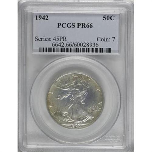 <B>1942 50C PR66 PCGS.</B></I> Delicate cream and silver-gray patina drapes the moderately reflective surfaces of this final-year Walker proof. Decisively struck with exquisitely preserved fields beneath the toning.<BR><BR><B>Coin Engraver:</B> Adolph A. Weinman<BR><BR><b>Shipping:</b> Coins & Currency (<a target="_blank" href="http://www.heritageauctions.com/common/shipping.php">view shipping information</a>)