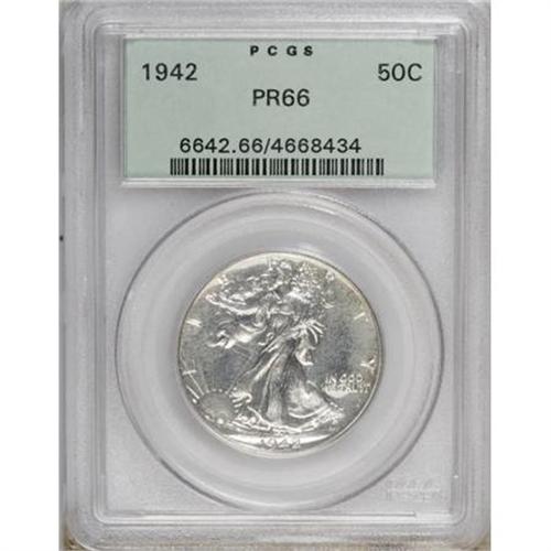<B>1942 50C PR66 PCGS.</B></I> PCGS Population (1473/735). NGC Census: (1252/885). Mintage: 21,120. Numismedia Wsl. Price for NGC/PCGS coin in PR66: $665. (#6642)<BR><BR><B>Coin Engraver:</B> Adolph A. Weinman<BR><BR><b>Shipping:</b> Coins & Currency (<a target="_blank" href="http://www.heritageauctions.com/common/shipping.php">view shipping information</a>)