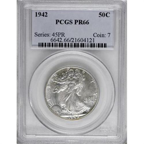 <B>1942 50C PR66 PCGS.</B></I> A boldly impressed and gleaming Premium Gem survivor from this final-year proof Walker issue. Light silver-gray patina with milky elements has settled over each side.<BR><BR><B>Coin Engraver:</B> Adolph A. Weinman<BR><BR><b>Shipping:</b> Coins & Currency (<a target="_blank" href="http://www.heritageauctions.com/common/shipping.php">view shipping information</a>)