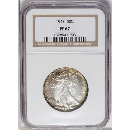 <B>1942<50C> PR67 NGC.</B></I> A deeply reflective Superb Gem with magnificent detail. Mustard-gold and russet patina appears at the periphery, while the centers are brilliant.