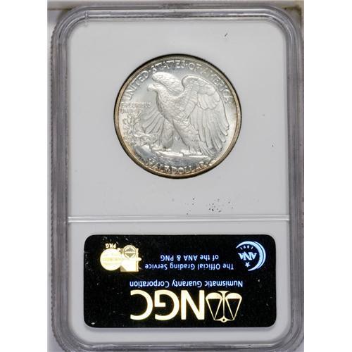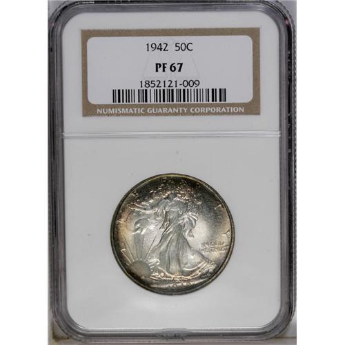 <B>1942<50C> PR67 NGC.</B></I> Golden-brown and lime-green margins frame brilliant centers. Thorough examination does not reveal any hairlines, and the strike is sharp although not absolute in the centers. World War Two ended proof production of the type.